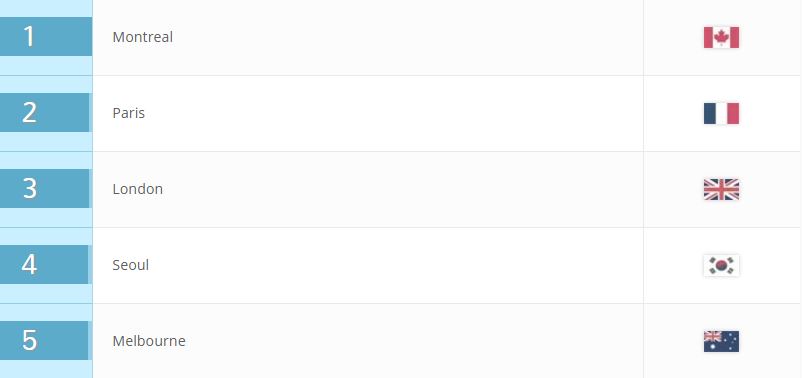2017 QS最佳大學城市排名發(fā)布,加拿大蒙特利爾從去年的第七位升至第一,終結(jié)巴黎的五連冠。巴黎掉至第二位,主要是因為在支付能力和向往度兩方面得分下降。倫敦由去年的第五名上升至第三,去年第十名的首爾升至第四,而墨爾本則由去年的第二跌至第五。中國最好成績是排在第11位的香港,上海和北京分列第25和30名。(美通社,2017年2月15日倫敦)