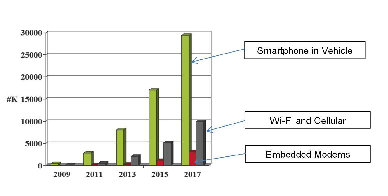 與當(dāng)今手機極為相似的是,“永久性”聯(lián)網(wǎng)汽車將迎來令人振奮的用戶/車輛互動性。有很多種方法可以讓聯(lián)網(wǎng)汽車成為現(xiàn)實。其中一個解決方案是將智能手機嵌入汽車儀表盤和中控臺,但還是會受到限制。主要是因為手機網(wǎng)絡(luò)共享很難適應(yīng)許多預(yù)期的車載信息需求。