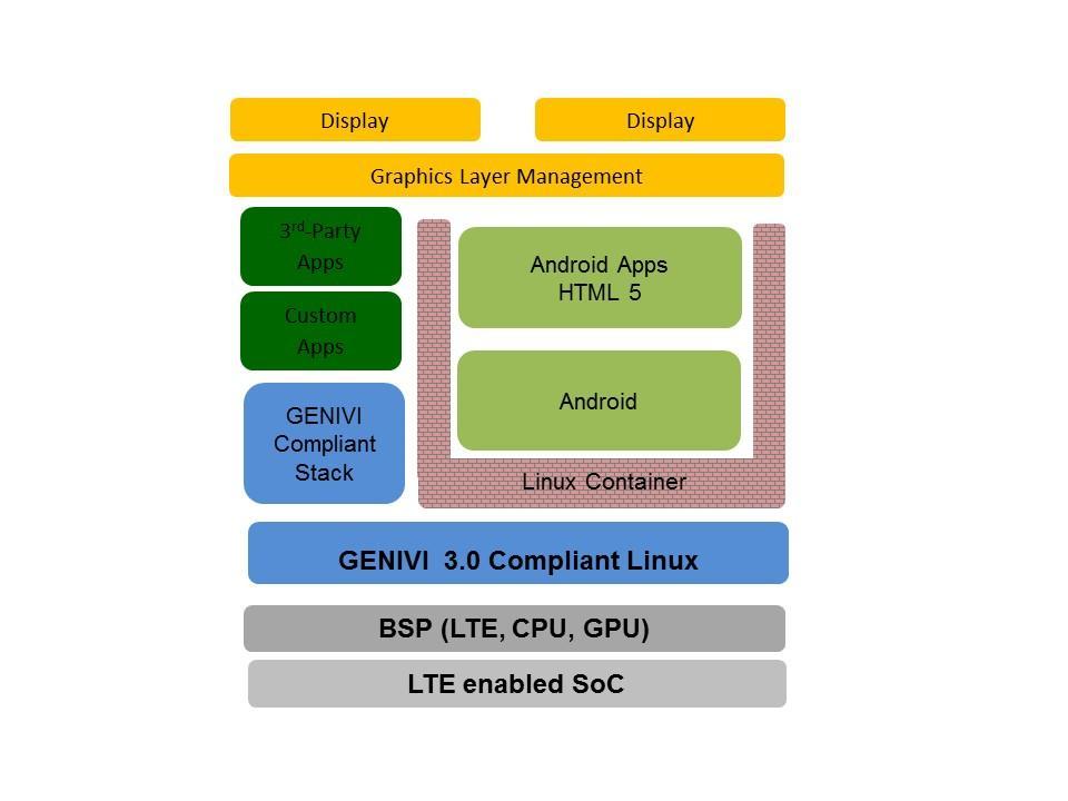 汽車制造商還在想辦法整合車輛功能,其中一個方法是在一個硬件平臺上運行多種操作系統(tǒng)和服務(wù)。下面的結(jié)構(gòu)顯示,標(biāo)準(zhǔn) GENIVI Linux 平臺頂部裝載了 Linux 容器 (LXC),容器內(nèi)部則能安裝安卓等客戶操作系統(tǒng)。這樣系統(tǒng)用戶能夠安全地下載使用安卓應(yīng)用,核心車載功能也不會受到影響(圖2)。