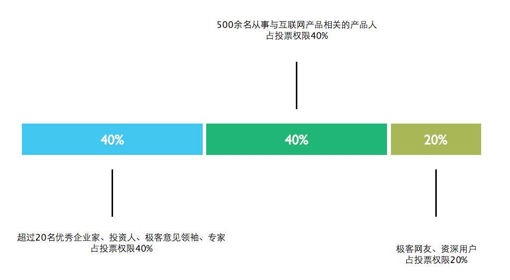 沒(méi)開(kāi)玩笑。盡管業(yè)界大大小小的評(píng)選很多,很多評(píng)選都是在灰色地帶游走,對(duì)業(yè)內(nèi)人士來(lái)說(shuō),“買獎(jiǎng)”是一種再也正常不過(guò)的行為了。但是,極客公園不想評(píng)了一年就跟大家說(shuō)拜拜,而是希望中國(guó)互聯(lián)網(wǎng)創(chuàng)新產(chǎn)品評(píng)選成為中國(guó)互聯(lián)網(wǎng)的“奧斯卡”,并一直用專業(yè)的精神和嚴(yán)謹(jǐn)?shù)膽B(tài)度,推動(dòng)產(chǎn)品思維和創(chuàng)新精神。所以,極客公園定制了嚴(yán)格的投票機(jī)制,以保證評(píng)選的公平和公正。這個(gè)投票機(jī)制可以簡(jiǎn)化為下圖: