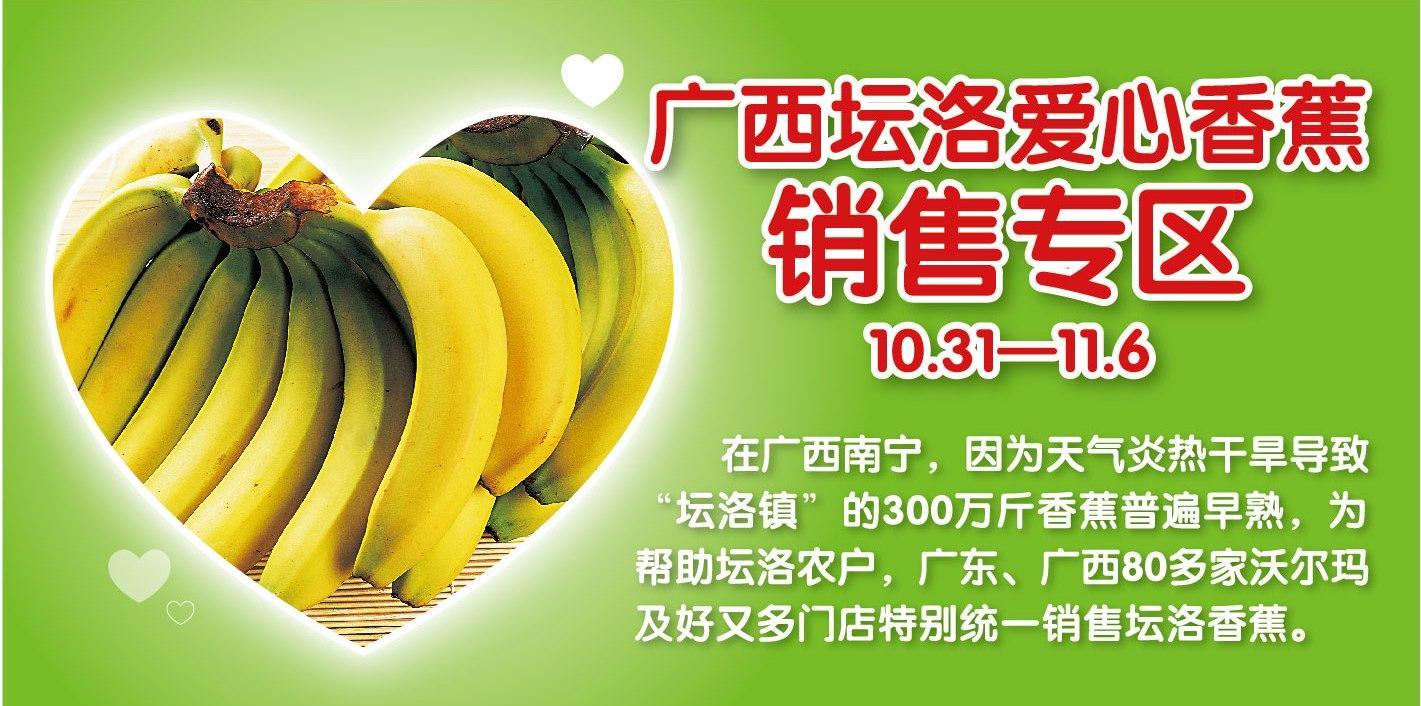 中國(guó)南寧2013年11月4日電 /美通社/ -- 因天氣炎熱干旱,廣西南寧壇洛鎮(zhèn)的300萬(wàn)斤香蕉普遍早熟,使上市高峰提前來(lái)到,熟蕉賤賣卻仍無(wú)人問津,蕉農(nóng)損失慘重。沃爾瑪?shù)弥闆r后,迅速與香蕉商會(huì)對(duì)接,收購(gòu)近8.5噸香蕉。10月31日起到11月6日,廣東、廣西80多家門店統(tǒng)一銷售愛心香蕉,幫助壇洛農(nóng)戶解決燃眉之急。
