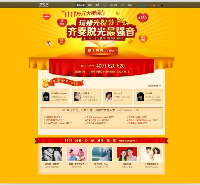 珍愛網(wǎng)為了一次滿足光棍們的N個(gè)愿望,瘋狂光棍節(jié)1111萬人工紅娘大回饋活動(dòng)不僅有脫光利器珍愛網(wǎng)VIP會(huì)員大優(yōu)惠,還包括購物、吃喝、旅游、表白等多個(gè)脫光驚喜,以線上、線下活動(dòng)結(jié)合的形式給予光棍們最貼心的溫暖。