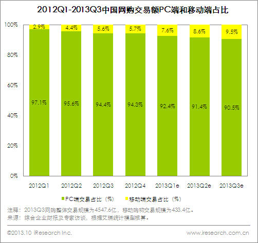 2013Q3移動(dòng)購物市場(chǎng)滲透率9.5%,較去年同期增長(zhǎng)近4個(gè)百分點(diǎn)