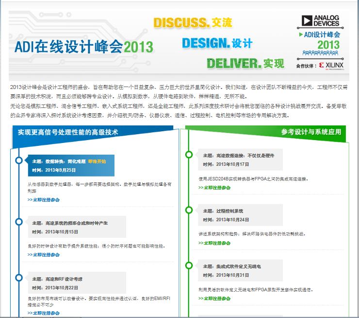 在接下來的活動(dòng)中,ADI 2013在線設(shè)計(jì)峰會(huì)將安排共6場(chǎng)高水準(zhǔn)的在線研討會(huì),包括ADI專家團(tuán)隊(duì)帶來的實(shí)現(xiàn)更高信號(hào)處理性能與參考設(shè)計(jì)和系統(tǒng)應(yīng)用為主題的技術(shù)指導(dǎo),如“數(shù)據(jù)與電源隔離”、“系統(tǒng)分割與設(shè)計(jì)”、“液體與氣體檢測(cè)”等精彩主題,活動(dòng)合作伙伴Xilinx還將展示他們基于ADI模擬和混合信號(hào)技術(shù)的領(lǐng)先解決方案。關(guān)注這些熱門主題的中國(guó)工程師們現(xiàn)在即可登陸ADI 2013在線設(shè)計(jì)峰會(huì)官方頁面并注冊(cè)參會(huì),精彩不容錯(cuò)過。本次峰會(huì)全部結(jié)束后,ADI還將貼心的對(duì)所有主題研討會(huì)的視頻和技術(shù)資源進(jìn)行為期四個(gè)月的在線展示,讓錯(cuò)失某期話題研討的工程師們不留遺憾。