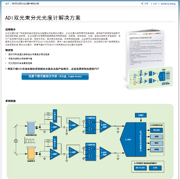 ADI推出的雙光束分光光度計解決方案是一款采用簡化光學系統(tǒng)的通用分光光度計,用于測量溶液、透明或不透明固體或者氣體的透射率或反射率,在物理、材料科學、化學和分子生物學等科研領域以及半導體、激光和光學制造等工業(yè)領域有著廣泛的應用。在分光光度計的設計中,隨時間和溫度的漂移是非常重要的考慮因素,這就需要低漂移的精確信號鏈和精巧的雙光束架構(gòu)設計。針對這一方案,ADI提供了門類齊全的包括放大器,模數(shù)轉(zhuǎn)換器,微控制器,基準電壓源,多路復用器和電源管理器件在內(nèi)的高性能產(chǎn)品組合,并以此構(gòu)建了雙通道色度計演示系統(tǒng)。與該解決方案配套提供的包括參考電路,應用筆記和設計工具在內(nèi)的一系列設計資源亦為用戶提供了進一步的設計便利。