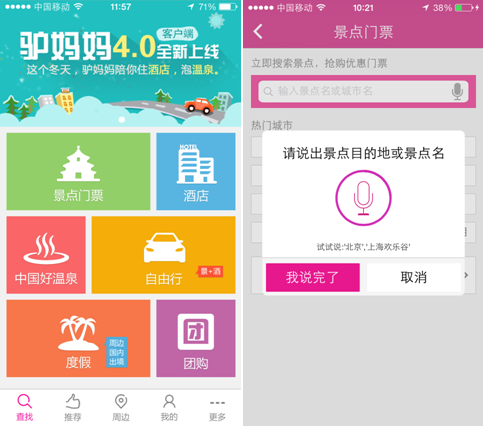 值得一提的是,本次驢媽媽旅游網(wǎng)手機(jī)客戶端4.0版還創(chuàng)新性地推出了特色頻道“語音搜索”。區(qū)別于以往用戶只能使用鍵盤或者手寫輸入的方式訂購旅游產(chǎn)品,驢媽媽新版手機(jī)客戶端的“語音搜索”功能將給用戶帶來全新的搜索體驗(yàn)。用戶只需對(duì)著手機(jī)說出景點(diǎn)目的地或景點(diǎn)名稱、旅行或度假目的地等關(guān)鍵字,便可以輕松地獲得所需要的旅游資訊,將個(gè)性化和人性化的服務(wù)應(yīng)用于移動(dòng)客戶端。