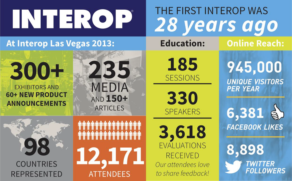 Interop Las Vegas是由全球第二大展覽公司UBM Tech 主辦的全球較大的網(wǎng)絡(luò)通信展會之一,距今已有28 年歷史。Interop 每年都吸引來自全球的數(shù)百家展商及專業(yè)媒體參與其中,分享最新的網(wǎng)絡(luò)通信業(yè)界動態(tài)。其中,Interop Las Vegas 2013 的參展商超過了350 家,主辦方邀請到330 位全球知名演講嘉賓共帶來185 場精彩演講,另外,來自98 個國家的12171 名與會者以及235 家專業(yè)媒體參與活動現(xiàn)場。Interop已經(jīng)成為業(yè)界公認(rèn)獲取關(guān)于最新 IT 趨勢及更好見解的高效平臺,關(guān)鍵技術(shù)伙伴以及各行業(yè)市場參與者能獲得所需的合適解決方案。
