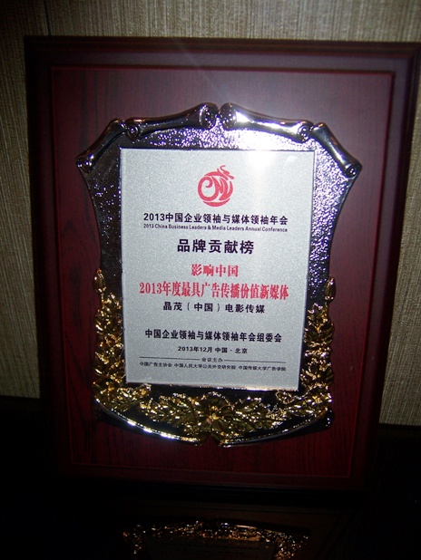北京2013年12月17日電 /美通社/ -- 以“傳播正能量,共筑中國夢”為主題,備受國內(nèi)企業(yè)界、傳媒界、廣告界、藝術(shù)界關(guān)注的“2013中國企業(yè)領(lǐng)袖與媒體領(lǐng)袖年會”暨“品牌貢獻榜年度盛典”,近日在北京金隅喜來登酒店盛大舉行。晶茂(中國)電影傳媒喜獲品牌貢獻榜“2013年度最具廣告?zhèn)鞑r值新媒體”大獎。